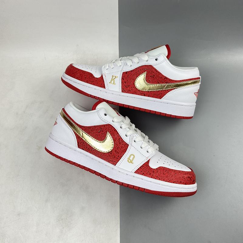 In design, though, the colorway exudes the winner’s mentality, featuring regal, bold detailing throughout. These, which wrap the toe as well as the mid-panel, mimic the finest deck of cards, complementing the King and Queen symbols that dress the left and right foot, respectively. Elsewhere, the base lays a flat white, while the Swoosh and adjacent logos cast themselves in luxe golds. The tongue label, then, rounds us out with the titular Spades as the heel threads its Wings in red.