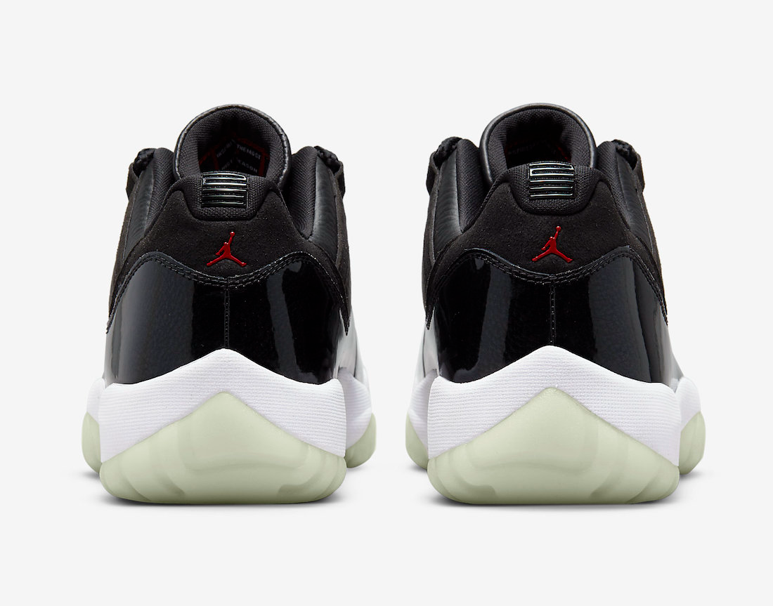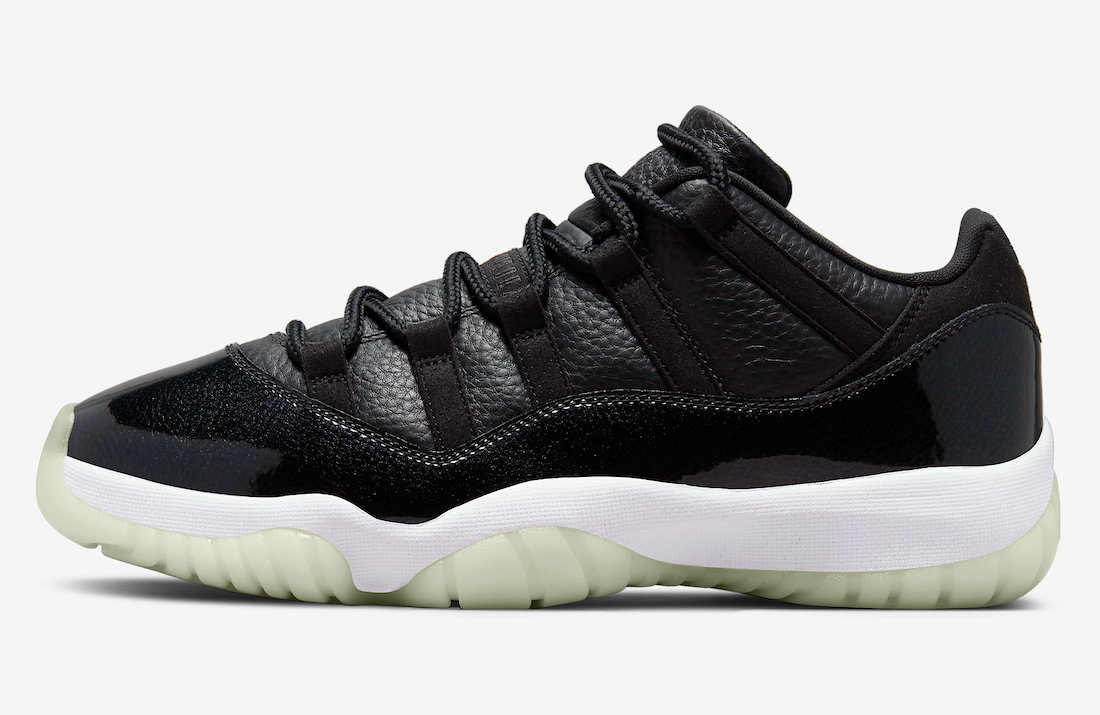 The Air Jordan 11 Retro Low ‘72-10’ brings back a celebratory design theme first featured on an Air Jordan 11 release from 2015. Like its predecessor, this pair nods to the Chicago Bulls’ legendary 1996-96 season, when Michael Jordan led the team to a record-breaking 72-10 record. Rendered in low-top form, the sneaker makes use of a black tumbled leather upper with a tonal patent leather mudguard. Crimson Jumpman branding delivers color-popped accents on the tongue and heel. Lightweight cushioning is provided by a white Phylon midsole, fitted with full-length Air-sole cushioning and supported by a translucent rubber midsole. The Jordan 11 Low '72-10' will release on May 14, 2022.