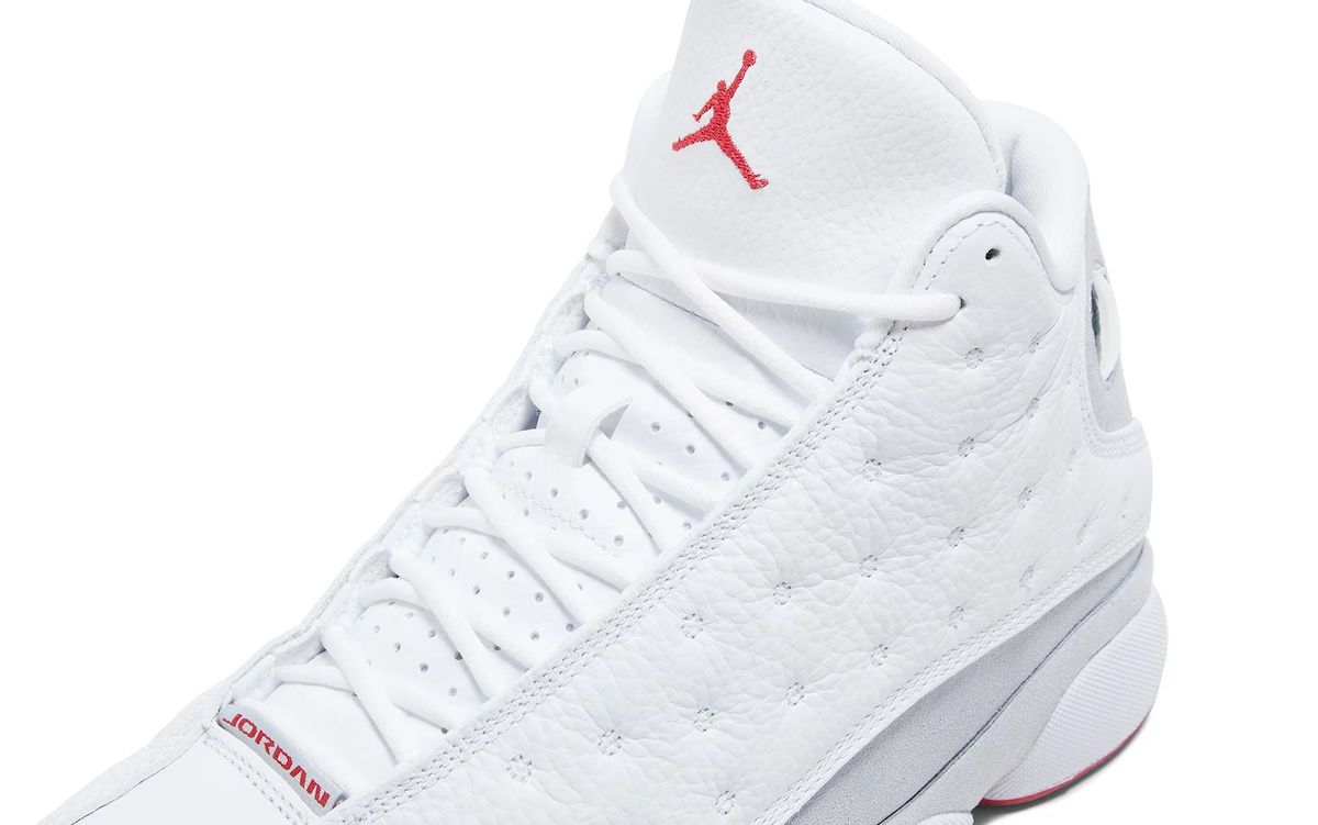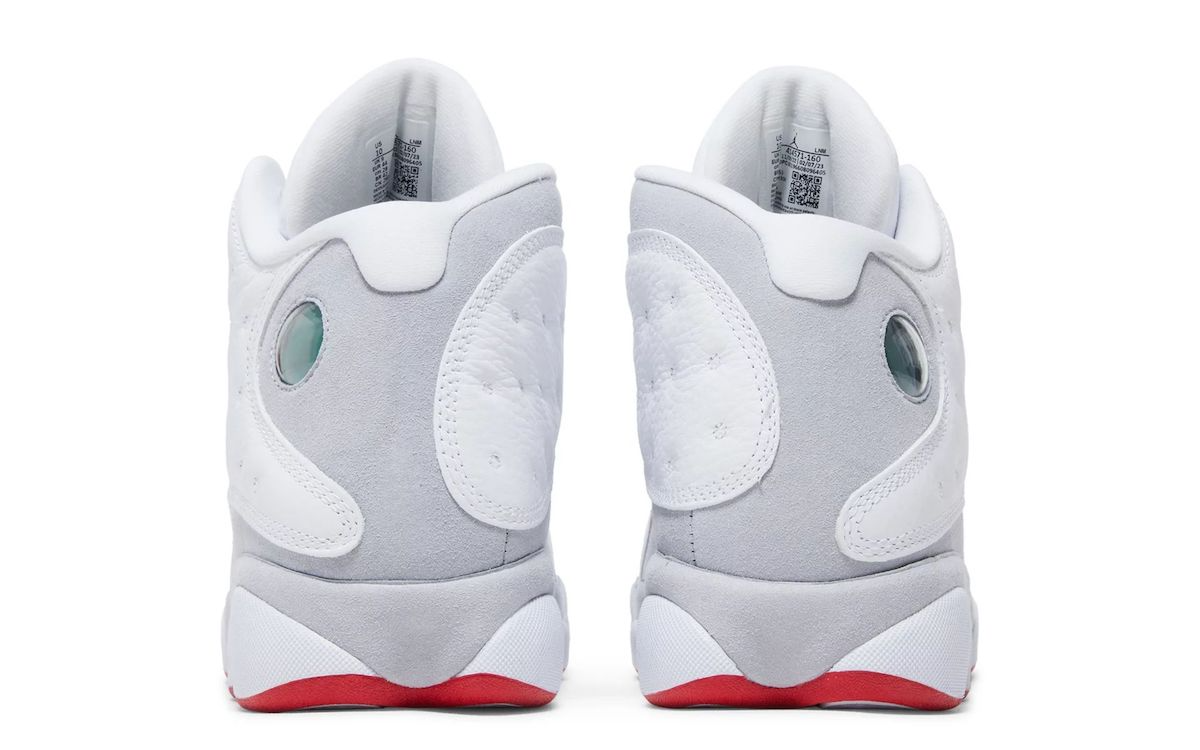 The Air Jordan 13 Retro 'Wolf Grey' showcases an elegant color scheme of the classic model which was inspired by Michael Jordan's 'Black Cat' persona. The shoe's upper unit is made up of a base in white leather intersected by grey synthetic suede paneling and dimpled overlays in white tumbled leather. Stitched on the tongue is a scarlet Jumpman, while the lateral collar is adorned with the 13's holographic cat eye design. The Phylon midsole is covered in grey synthetic suede, supported by a carbon fiber shank plate and a red panther-paw outsole for stylish support underfoot.