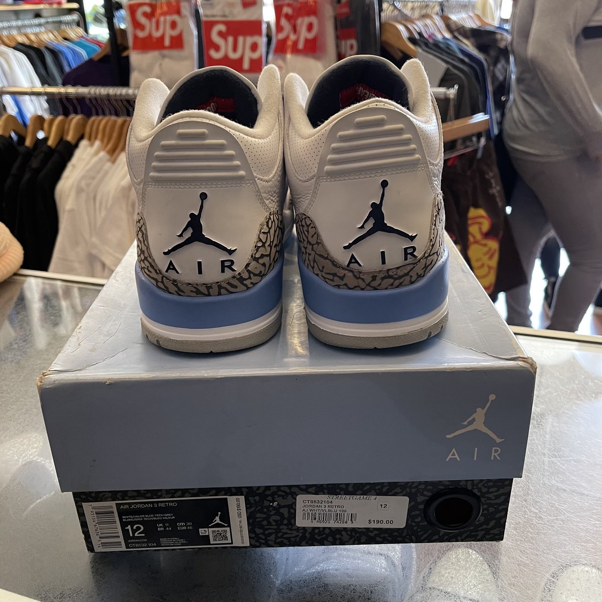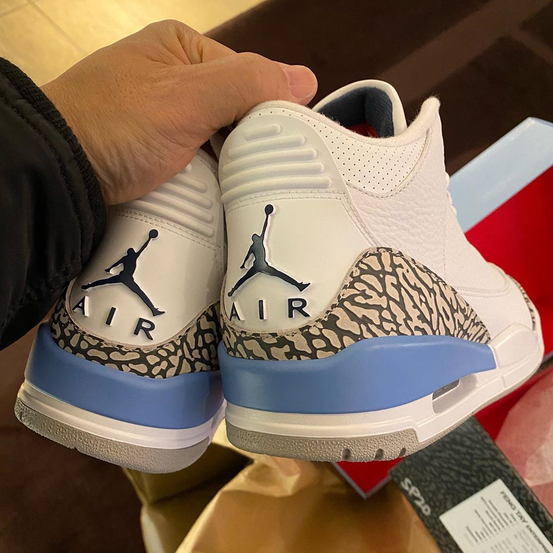 The Air Jordan 3 “UNC” is a Carolina-blue-based colorway of the Jordan 3 design inspired by the University of North Carolina Tarheels. The “UNC” makeup of the Air Jordan 3 first arrived as a player exclusive during the 2018 Men’s March Madness Basketball Tournament and now re-appears as a separate release for the general public. Similar to the PE version, the retail Air Jordan 3 “UNC” features a white tumbled leather base that includes hits on the toe and mid-panel. Contrasting along the mudguard comes in the form of Air Jordan 3-specific elephant print on the toe, lateral panel, and heel that contrasts a solid white leather mudguard. Completing the look is black Jumpman branding on the heel and a light grey outsole. Release date: Spring 2020.