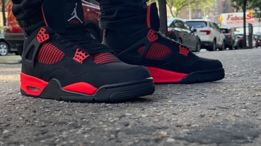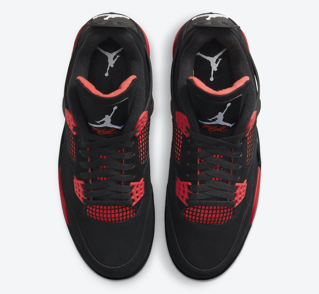 The Air Jordan 4 Retro ‘Red Thunder’ features familiar color blocking that recalls the coveted ‘Thunder’ colorway, originally released in 2006 and subsequently reissued in 2012. The mid-top sports a black nubuck upper with contrasting pops of crimson in lieu of the older shoe’s Tour Yellow accents. They appear on the sneaker’s molded eyelets, interior tongue, quarter panel, throat and midsole, which packs visible Air-sole cushioning under the heel. Jumpman branding decorates the tongue tag and heel.