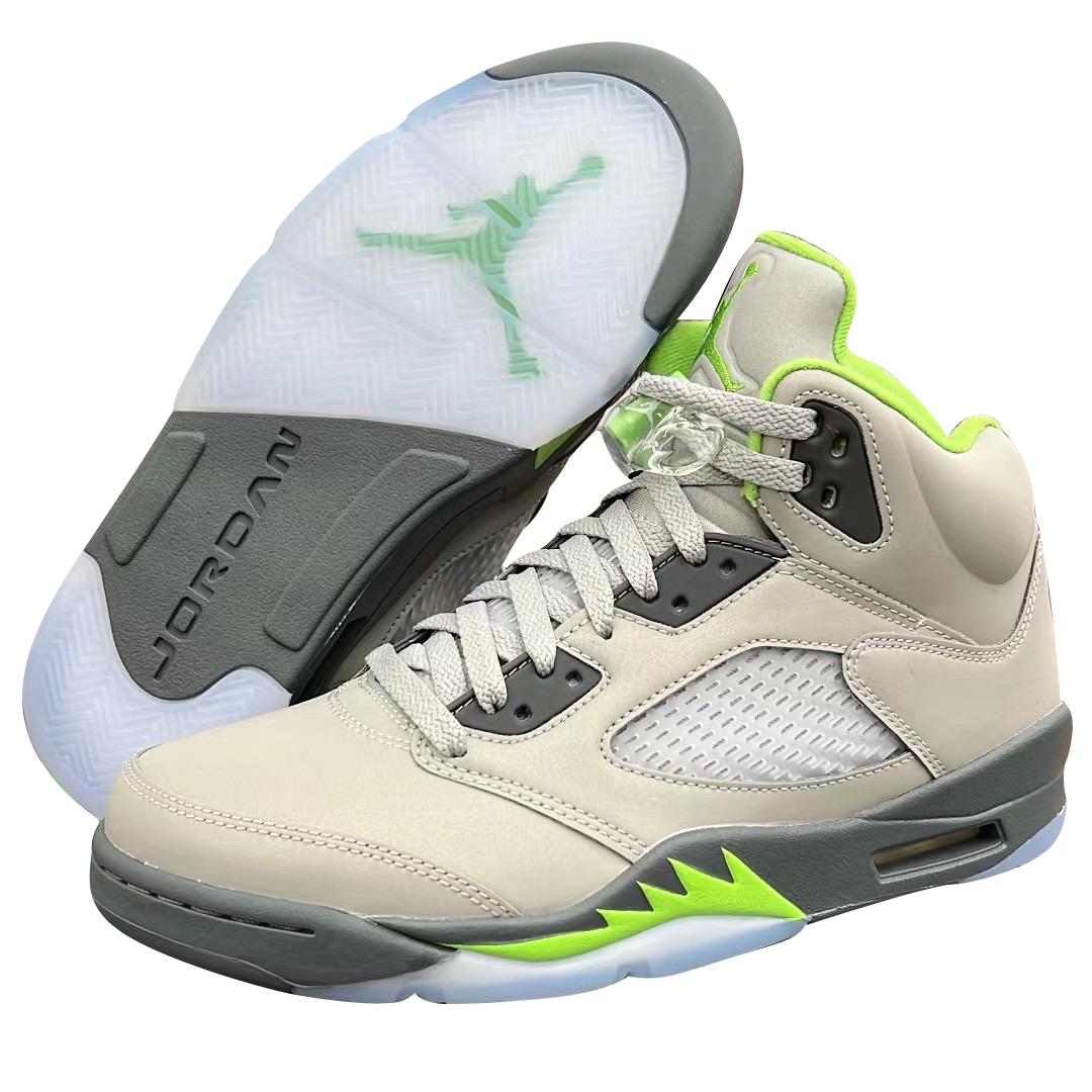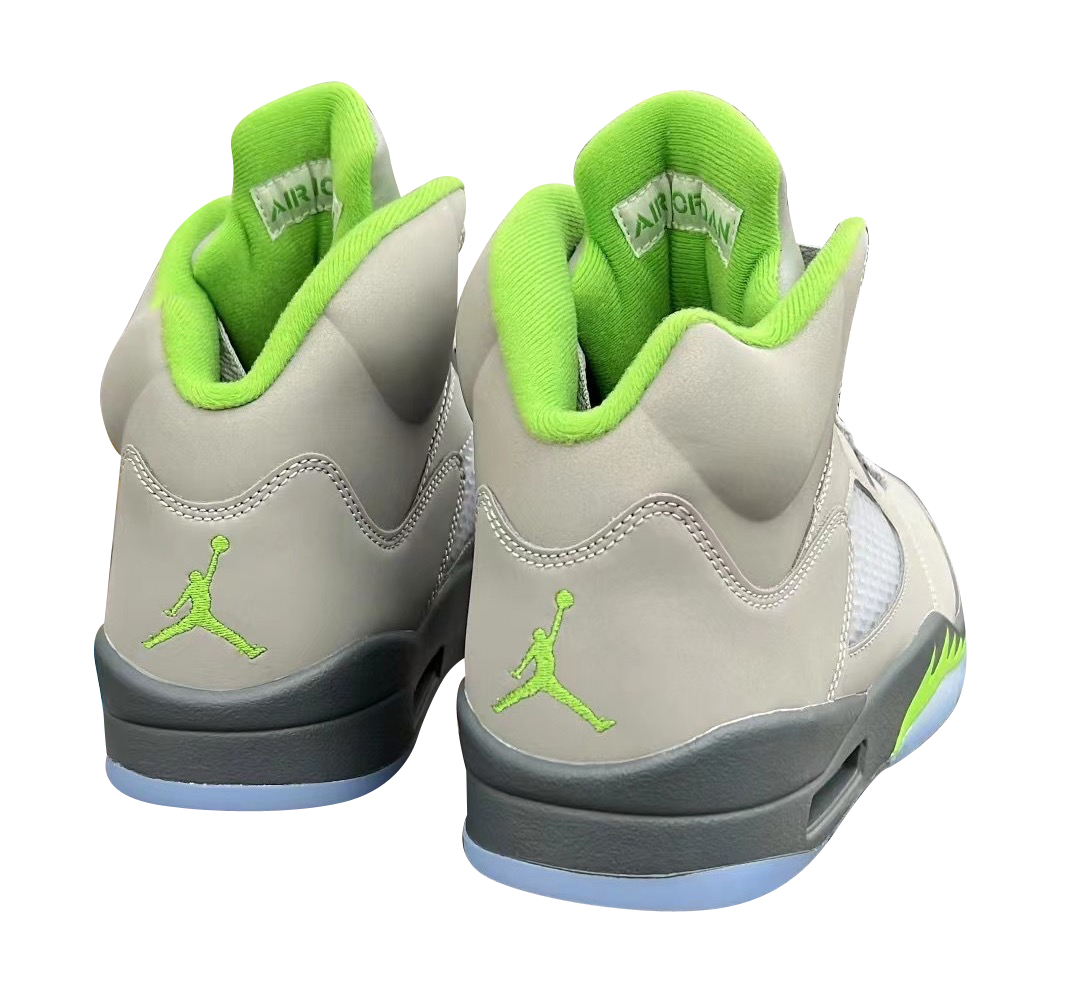 Bringing back a two-tone colorway first released in 2006 is the 2022 edition of the Air Jordan 5 'Green Bean." Similar to the original mid-top, a light grey nubuck upper is entirely coated in a reflective finish. Bright green accents make their way to the interior lining and the embroidered Jumpman logo on the heel and tongue, which is repeated on the shark-tooth detailing that enlivens the dark grey polyurethane midsole. It's built on a translucent herringbone-tread rubber outsole.