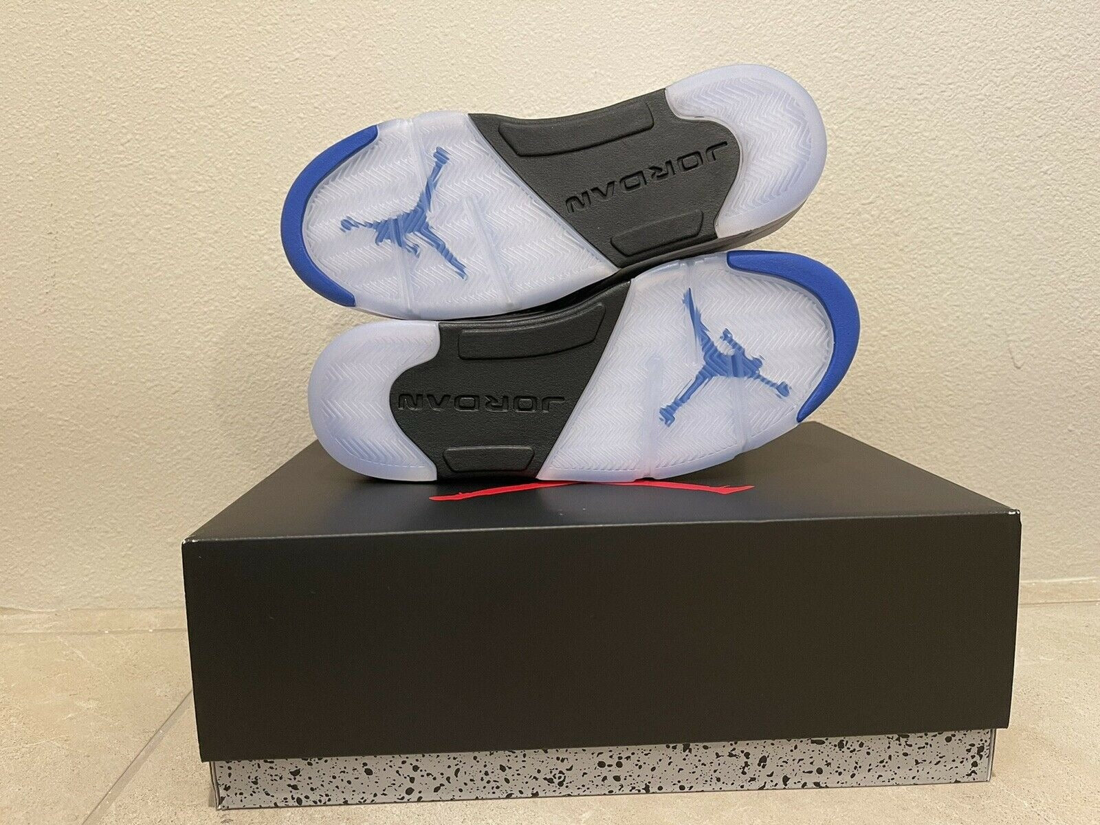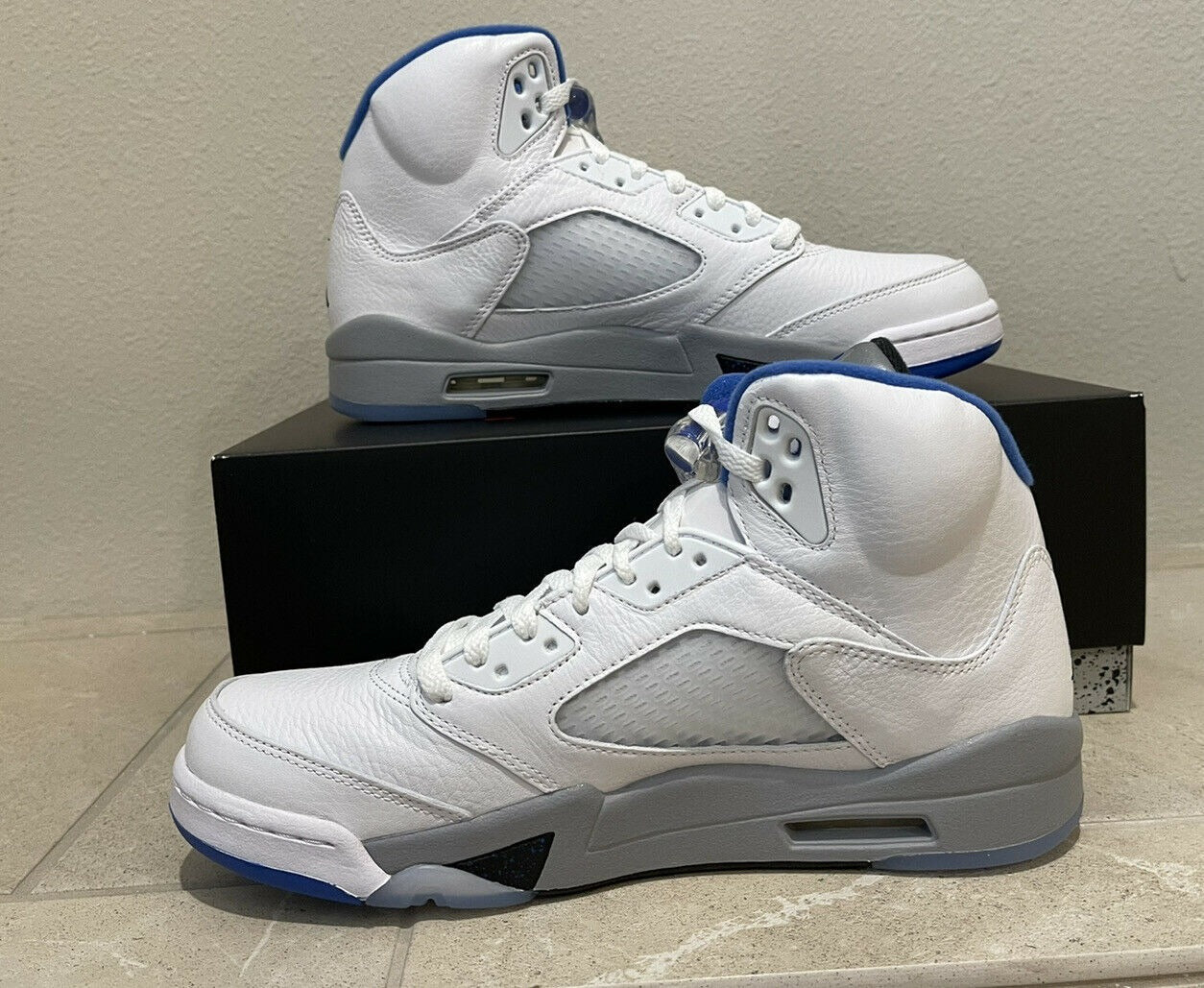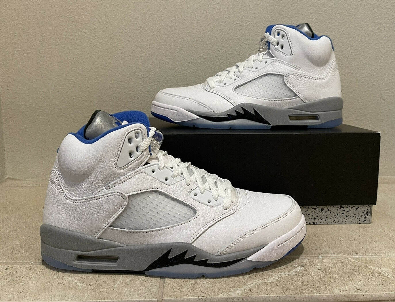 The Air Jordan 5 “Stealth 2.0” is a modern reinterpretation of the popular non-original colorway of the model that was originally released in 2006. The first “Stealth” Jordan 5 debuted during a time period in which Jordan Brand was re-imagining its core classic Air Jordan models as “lifestyle” shoes by arranging them in materials and colors that could be worn off the court. The look of the "Stealth 2.0" is quite similar to the original "Stealth" design from 2006. Both feature a crisp white leather upper with translucent netting on the mid-panel and tongue. The “Stealth 2.0” displays a black embroidered Jumpman on the heel, differing from the blue Jumpman logo on the original '06 release. The other main difference is found on the midsole. Both releases feature a grey midsole, but the new "Stealth 2.0" includes black "shark tooth" detailing speckled with blue. The original design features solid blue shark tooth accenting. An icy blue translucent outsole rounds out the look of the shoe.