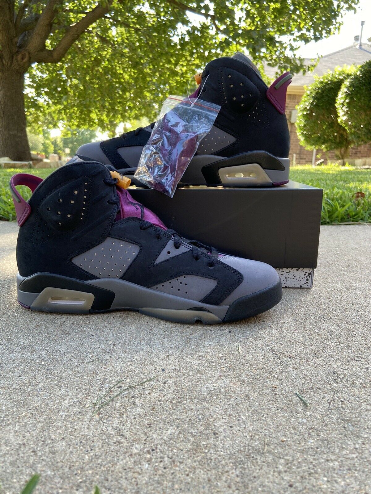 The Air Jordan 6 Retro ‘Bordeaux’ takes on a familiar color scheme tied to the shoe’s successor, the Air Jordan 7. Soft nubuck construction is utilized on the upper, featuring a neutral grey base with contrasting black overlays. The translucent tongue features a multicolor print that replicates the look of the AJ7’s neoprene tongue, while Bordeaux accents land on the throat and molded heel tab. Lightweight cushioning arrives via the visible Air-sole unit nestled in the heel of a grey and black polyurethane midsole.