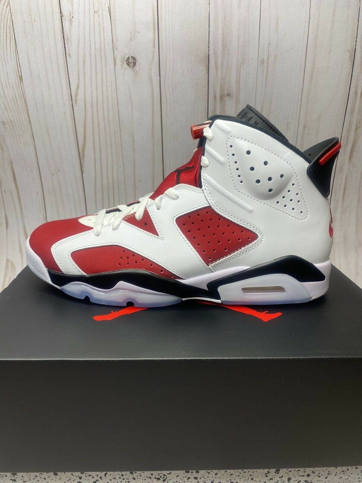 The Air Jordan 6 “Carmine 2021” is an original colorway of Michael Jordan’s sixth signature shoe that was re-released by Jordan Brand in 2021. This version of the “Carmine” brings back the original “Nike Air” branding on the back of the shoe for the first time since the colorway’s debut in 1991. The return to the “OG” styling coincides with the Jordan 6’s 30-year-anniversary celebration in 2021. Along with the “Nike Air” embroidery on the heel, the rest of the shoe retains the correct height and panel shapes as the inaugural release. That includes white leather overlays on the forefoot, mid-panel, and eyelets above the fiery red synthetic nubuck base. Perforations on either side of the shoe and collar are consistent with the original styling of the Air Jordan 6. A black liner and neoprene lace shroud with black Jumpman embroidery compliment the shoe’s retro style. The “Nike Air” logo on the heel sits beneath a spoiler-style heel tab to complete the look.