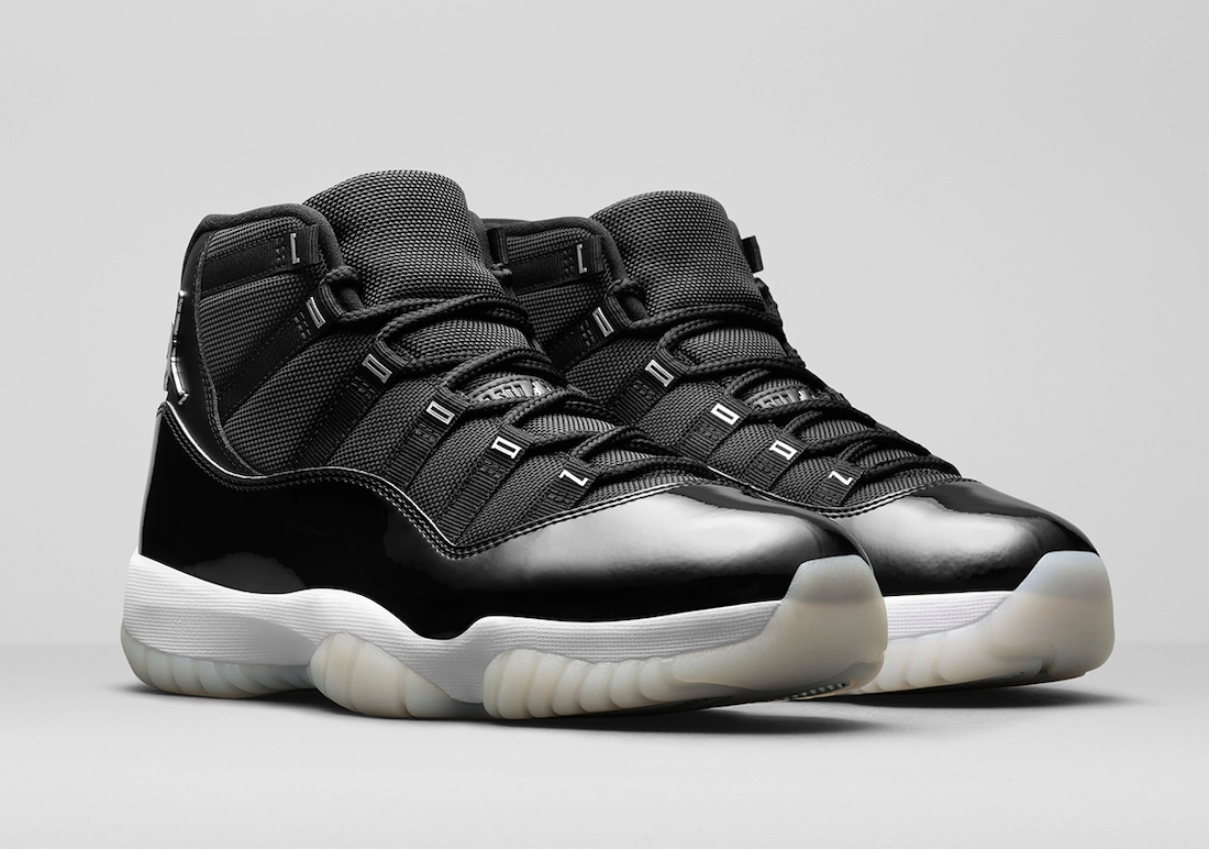 The Air Jordan 11 'Jubilee', also known as the Air Jordan 11 '25th Anniversary', celebrates the classic silhouette's quarter-century birthday with a monochrome black finish throughout the upper, constructed from a traditional blend of ballistic mesh and patent leather. In keeping with the shoe's silver anniversary, a 3D metallic Jumpman and matching '23' branding decorate the heel, while 'Jordan' is spelled out in stylized silver lettering on each of the sneaker's eyelets. The mid-top rides on a classic white foam midsole, supported by a translucent rubber outsole.